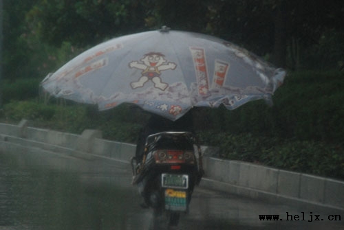 撑着广告伞骑车避雨,效果不错
