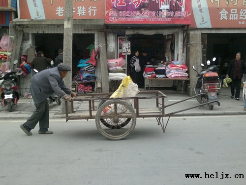路遇一老人,反过来推着板车前行。
